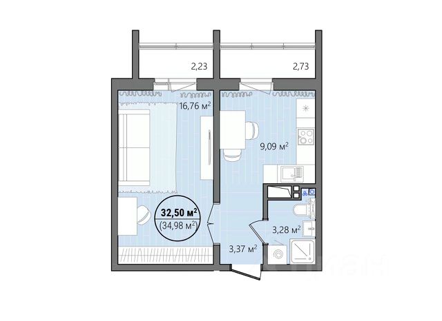 • Площадь: 44,9 кв.м. Удобная планировка: кухня 17 кв.м. и спальня 17 кв.м.