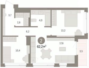 Квартира с кухней-гостиной и двумя спальнями в Брусника в Эльтауне. Особенности планировки: разнесённые спальни.