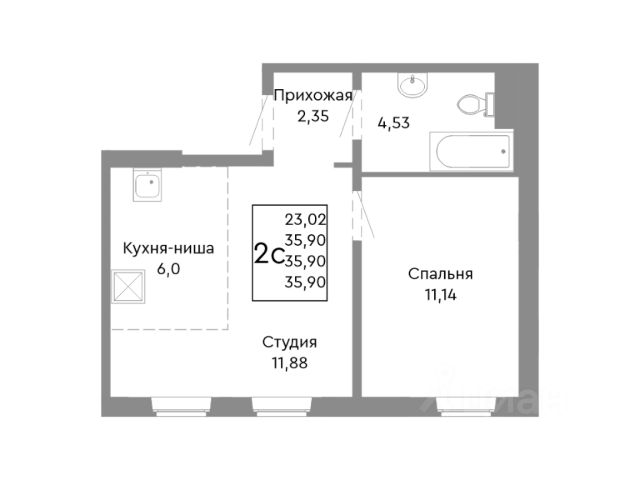 Продаётся 2-комнатная квартира в строящемся доме (Дом 12), срок сдачи: II-кв. 2027, общей площадью 35.9 кв.м., на 2 этаже.