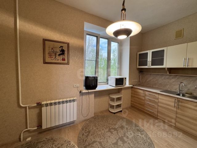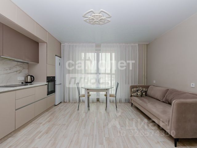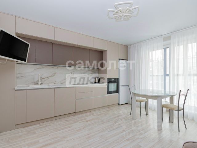 в студии - угловой кухонный гарнитур, варочная панель, духовой шкаф, холодильник, электрический чайник, микроволновка, обеденная зона, на стенах подвесные полки белого цвета, тюль, шторы, в зоне коридора большой шкаф-купе, встроенная гардеробная зона верхней одежды при входе в квартиру. Из кухни выход на просторную лоджию, на которой можно комфортно отдыхать, так же имеется теплый пол.