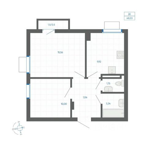 Квартира с кухней-гостиной и двумя спальнями в Бруснике в Эльтауне. Особенности планировки: балкон, вид во двор, гардеробная, новые лоты, постирочная, разнесённые спальни.