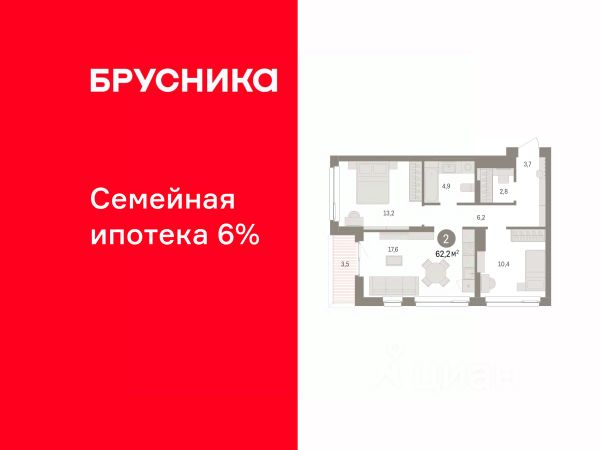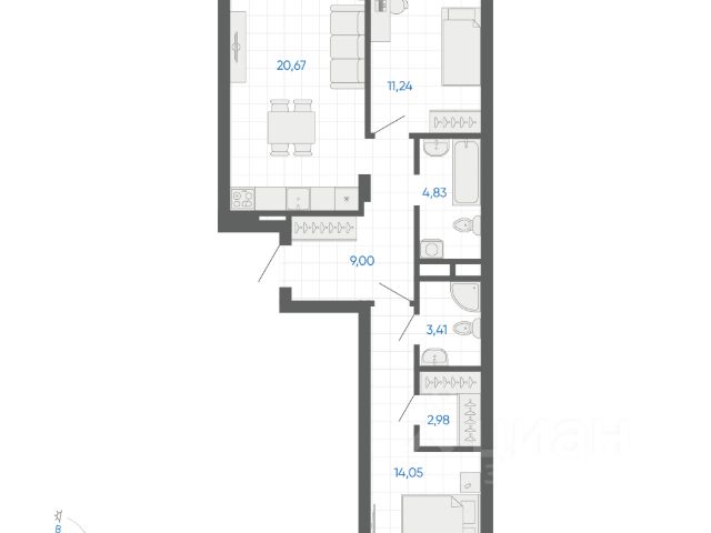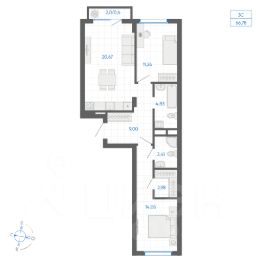 Квартира с кухней-гостиной и двумя спальнями в Брусника в Эльтауне. Особенности планировки: гардеробная, лоджия, разнесённые спальни.