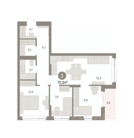 Квартира с кухней-гостиной и тремя спальнями в Брусника в Эльтауне. Особенности планировки: разнесённые спальни.