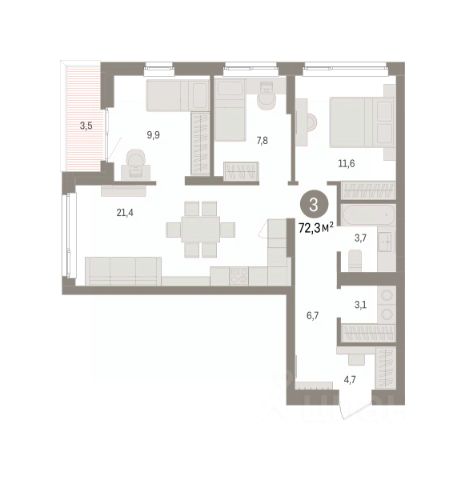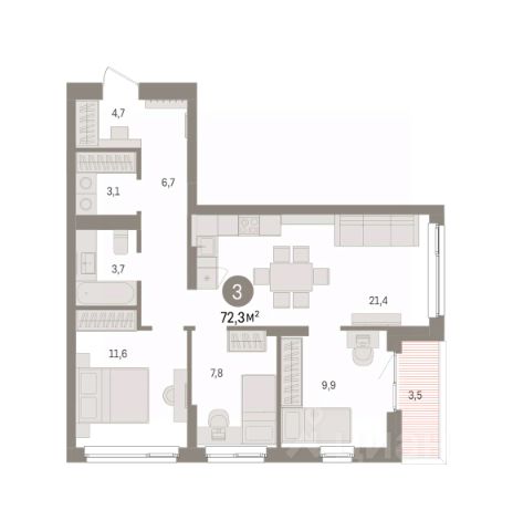 Трехкомнатная квартира с предчистовой отделкой в ЖК "Брусника в Эльтауне" на 3 этаже. Общая площадь: 72.34 кв.м., жилая: 29.3 кв.м., площадь просторной кухни-гостиной: 21.4 кв.м. Квартира угловая, очень светлая, естественная вентиляция при открытии окон. В квартире одна лоджия, один совмещенный санузел. Высота потолков 2.7 м.