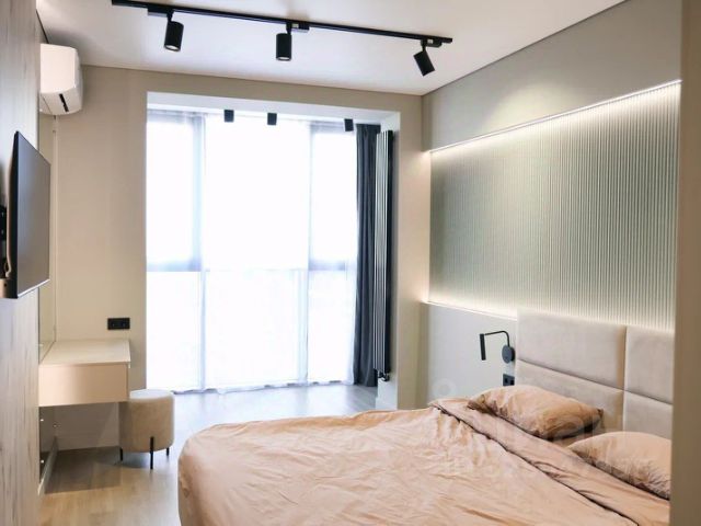 -Спальня, на полу кварц-винил, установления система хранения, двуспальная кровать ( матрас Аскона), стены выровнены, окрашены;