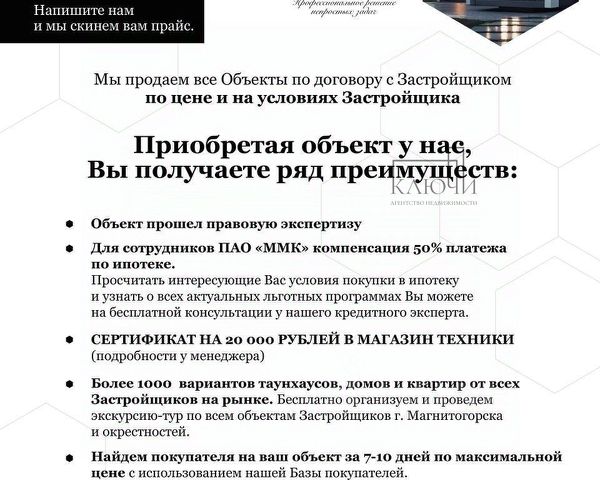 В продаже отдельно стоящий одноэтажный дом площадью 75 м. кв. на 5 сотках земли Подходит под льготную ипотеку 6% О Локации: Дом расположен в восточной части города на Левом берегу Магнитогорска Об объекте: Площадь 75 м. кв. 5 соток земли Пред чистовая отделка с красивым панорамным видом на город Планировка дома включает в себя: гостиную + кухню с выходом на участок, 2 спальные комнаты, котельную, Коммуникации: Электричество- центральное. Вода- скважина. Канализация - септик. Система отопления-газовый котел Можно в ипотеку (примерный расчёт): Стоимость 6 100 000 р. Первоначальный взнос 3 100 000 р. Ставка - 6% Ежемесячный платеж 17 987 р. Для сотрудников ПАО "ММК" действует компенсация платежа по процентам ипотеки, в размере 50% Если вы хотите узнать подробности по лоту или рассмотреть другие варианты недвижимости в данной локации позвоните нам или напишите в сообщения эксперту и получите подборку Лотов.. Арт. 112650857