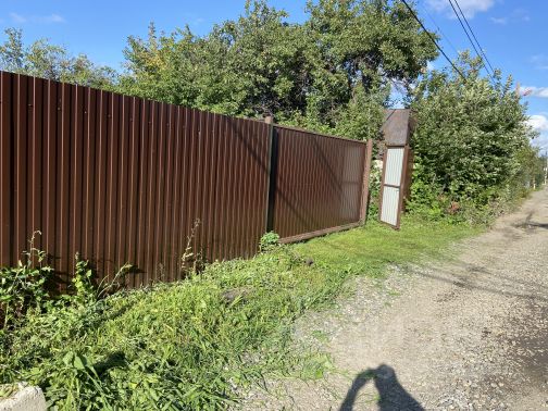 Участок поднят на 1 метр скальной вскрышей, огорожен забором из профнастила (лицевая сторона кирпич). Автоматические ворота и навес под 2 автомобиля.