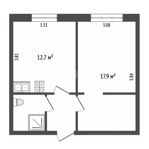 Общая площадь: 44.4 м² (включая кладовку 3 м²)
