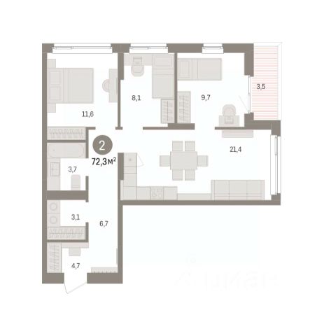 Трехкомнатная квартира с предчистовой отделкой в ЖК "Брусника в Эльтауне" на 8 этаже. Общая площадь: 110 кв.м. Высота потолков 2.7 м.