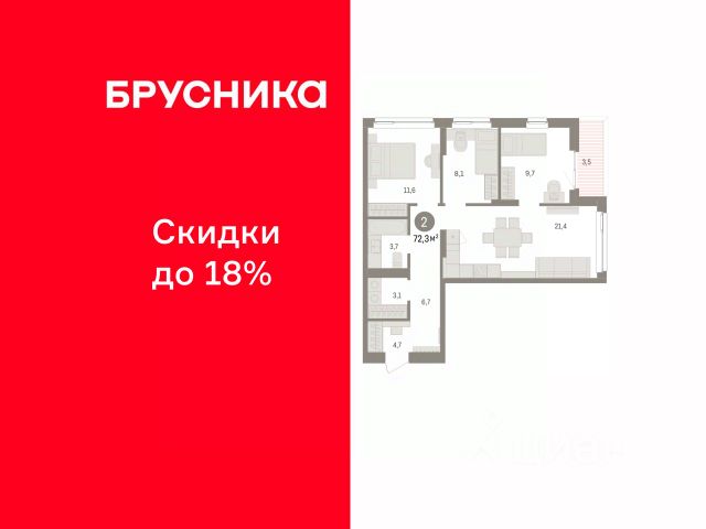 Квартира с кухней-гостиной и тремя спальнями в Бруснике в Эльтауне. Особенности планировки: второй санузел, гардеробная, мастер-спальня, новые лоты, постирочная, разнесённые спальни, терраса на крыше.
