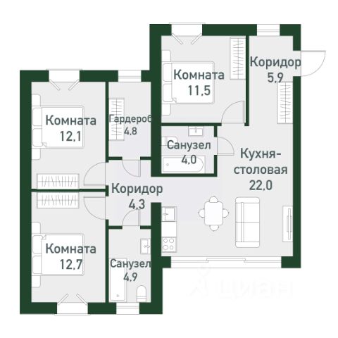 Квартира с кухней-гостиной и двумя спальнями в Брусника в Эльтауне. Особенности планировки: разнесённые спальни.