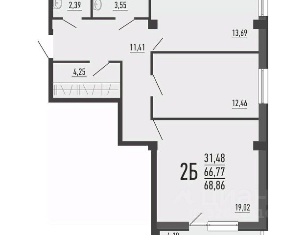 Площадь квартиры 57,2 кв.м: кухня - 10,7 кв.м с выходом на балкон, две отдельные спальни - 12,1 кв.м и 18,3 кв.м ( с выходом на вместительную лоджию), прихожая 10,7 кв.м. санузел раздельный в кафеле.