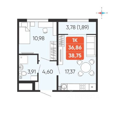 Квартира с кухней-гостиной и двумя спальнями в Бруснике в Эльтауне. Особенности планировки: балкон, второй санузел, гардеробная, новые лоты, разнесённые спальни.