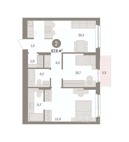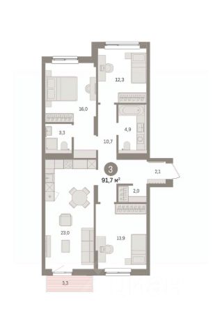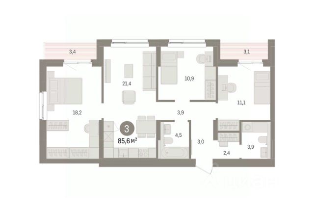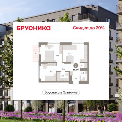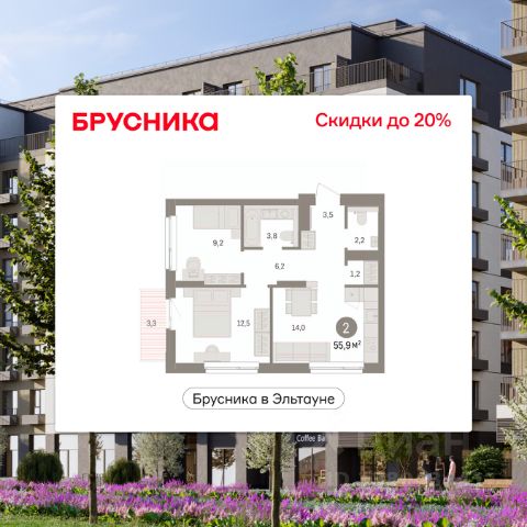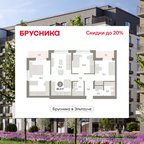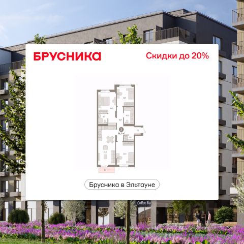 Квартира с кухней-гостиной и тремя спальнями в Бруснике в Эльтауне. Особенности планировки: балкон, второй санузел, гардеробная, мастер-спальня, новые лоты, окна на две стороны, разнесённые спальни.