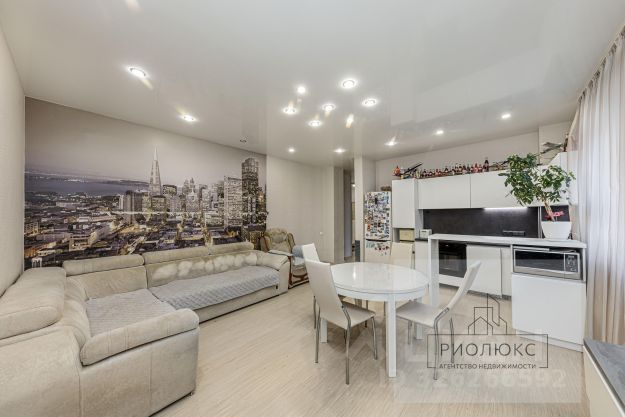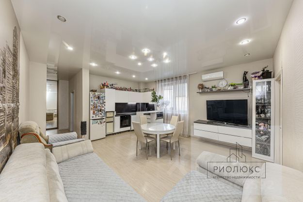В гостиной установлен качественный кухонный гарнитур со встроенной варочной панелью, духовым шкафом с вытяжкой, микроволновой печью, холодильником, посудомоечной машиной Bosch, кухонным измельчителем отходов Insenkerator Evolution. Встроенная мебель выполнена фирмой Rivolo. Из гостиной выход на теплую лоджию, оборудованную под кабинет. Диван в гостиной изготовлен Hausmebel. Органично расположена обеденная зона с видом на лес. Установлен кондиционер.