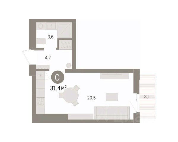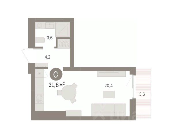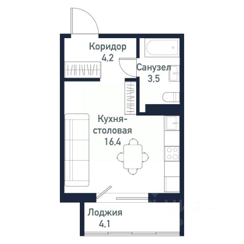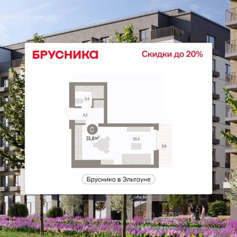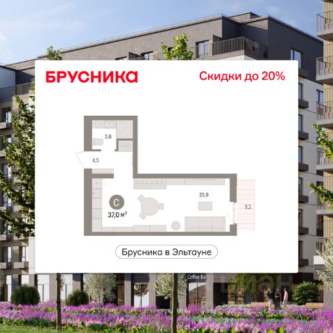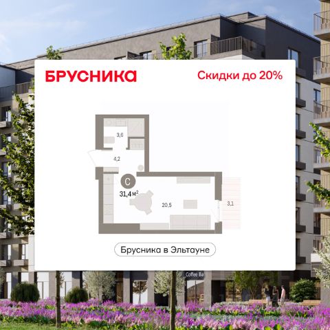 Студия в Бруснике в Эльтауне. Особенности планировки: балкон, вид во двор.