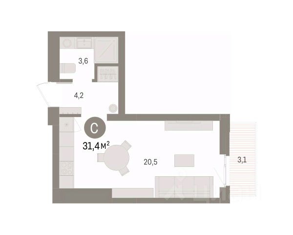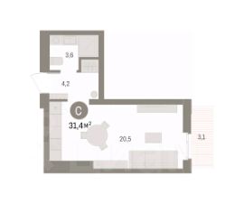 Просторная 1-комн. студия с предчистовой отделкой в ЖК "Брусника в Эльтауне" на 5 этаже. Общая площадь: 31.83 кв.м., площадь гостиной 20.4 кв.м., из которых 5 кв.м. выделено под кухонную зону. Все окна выходят на одну сторону. В квартире один балкон, один совмещенный санузел. Высота потолков 2.7 м.