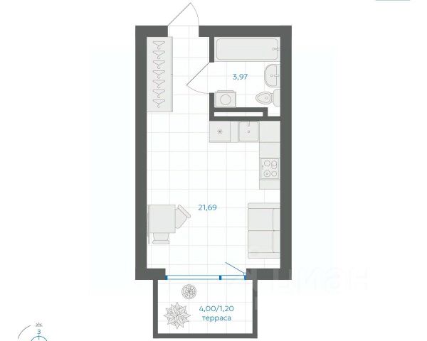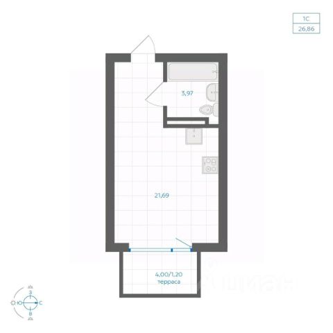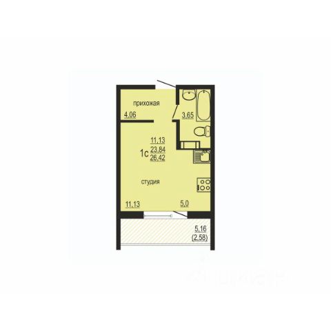 Студия в Бруснике в Эльтауне. Особенности планировки: балкон, вид во двор.
