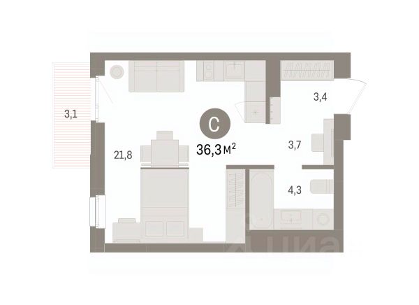 Однокомнатная студия от застройщика с предчистовой отделкой в ЖК "Брусника в Эльтауне" на 7 этаже. Общая площадь: 31.35 кв.м., площадь гостиной 20.5 кв.м., из которых 5 кв.м. выделено под кухонную зону. Все окна выходят на одну сторону. В квартире один балкон, один совмещенный санузел. Высота потолков 2.7 м.