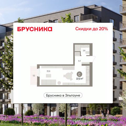 Студия в Бруснике в Эльтауне. Особенности планировки: балкон, вид во двор.