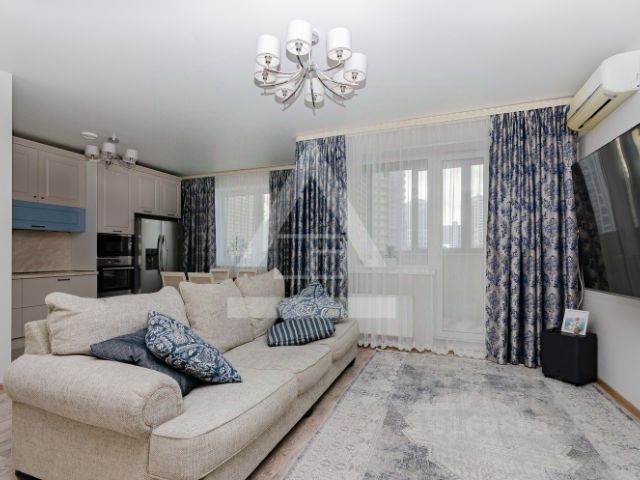 Квартира обустроена, выполнен свежий евроремонт, в отличном состоянии. Потолки- натяжные, светильники точеные и люстры светодиодные. Отделка пола - керамогранит и ламинат. Отделка стен - обои, ламинат, гипсовая плитка. В жилых комнатах установлены кондиционеры. В санузлах - электрические полотенцесушители. В спальне, детской, кухне внутрипольные конвекторы отопления. Теплый пол в санузлах, в гостиной и на лоджии.