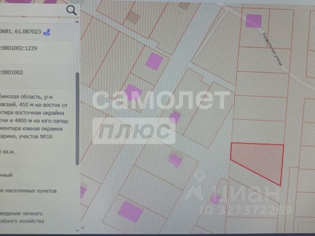 Продается земельный участок в с. Кременкуль на улице Перспективной, в 700 м от озера Большой Кременкуль. Общая площадь 800 кв.м., 8 соток. Категория земель: земли поселений (земли населенных пунктов). Разрешенный вид использования: для строительства индивидуального жилого дома. Кадастровый номер 74:19:1111041:91 Участок находится в экологически чистом месте в непосредственной близости от озера Большой Кременкуль. До автодороги 75К-205 Обход города Челябинска 800 метров. Периметр участка огорожен профнастилом. Форма участка располагает для воплощения ваших фантазий и ландшафтного дизайна. В непосредственной близости от участка березовая роща. Вокруг соседи проживают круглогодично и построены дома представительского класса. В с. Кременкуль развитая инфраструктура, есть все необходимое для постоянного проживания: магазины, школа, фитнес центры, больницы. Идеальное место для жилого дома, родового гнездышка, дачи в экологически чистом районе среди озер. Если вам понравился участок, возможно он нравится еще кому-то. Звоните, будьте в числе первых. Арт. 127182394