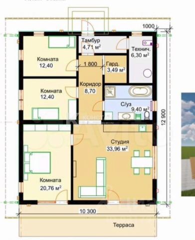 1ый этаж: крытое крыльцо, прихожая 6.8м2, хоз.помещение/постирочная с котельной 5.6м2, лестничный холл 6.3м2, гостевая ванная с с/у 7.4м2, кухня-столовая-гостиная 34.7м2 с выходом на крытую террасу 15м2 и видом во внутренний двор, гостевая спальня/кабинет 9.3м2;