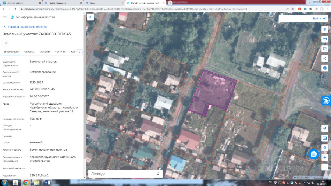 Земельный участок с кадастровым номером 74:30:0301017:945 площадь 806 по адресу Российская Федерация, Челябинская область, г Копейск, ул Саперов, земельный участок 12