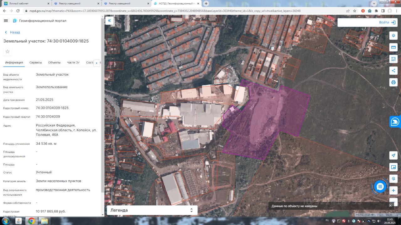 Земельный участок с кадастровым номером 74:30:0104009:1825 площадь 34536 по адресу Российская Федерация, Челябинская область, г. Копейск, ул. Полевая, 46А