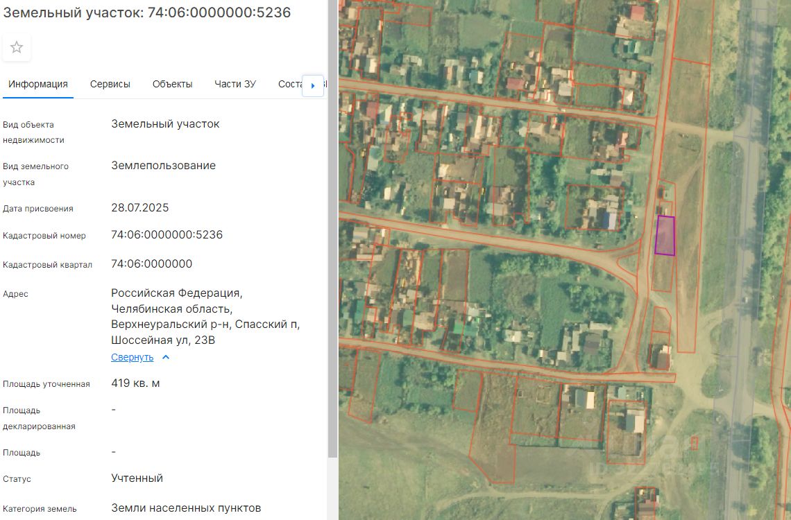 Земельный участок из земель населённых пунктов, с видом разрешенного использования "предпринимательство", с кадастровым номером 74:06:0000000:5236, расположенный по адресу: Челябинская область, Верхнеуральский р-н, п. Спасский, ул.Шоссейная, 23В, общей площадью 419 кв.м.