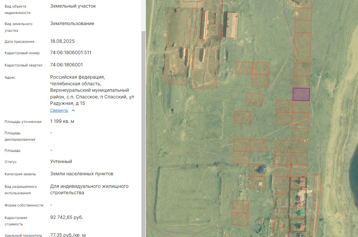 Земельный участок из земель населённых пунктов, с видом разрешенного использования "для индивидуального жилищного строительства", с кадастровым номером 74:06:1806001:511, расположенный по адресу: Челябинская область, Верхнеуральский муниципальный район, сп Спасское, п.Спасский, ул.Радужная, д.15, общей площадью 1199 кв.м
