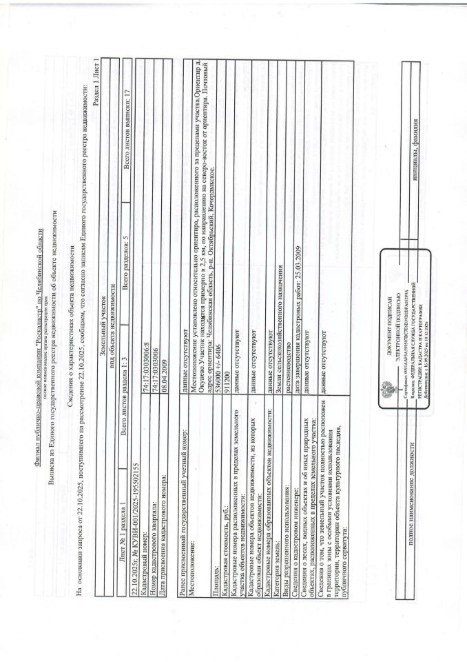 земельный участок из земель сельскохозяйственного назначения  Кочердыкского сельского поселения с кадастровым номером 74:17:0303006:8, местоположение установлено относительно ориентира, расположенного за пределами участка. Ориентир д. Окунево. Участок находится  примерно в 2,5 км по направлению на северо-восток от ориентира. Почтовый адрес ориентира: Челябинская область, Октябрьский район, Кочердыкское, разрешенное использование: растениеводство, общей площадью 536000 кв.м.