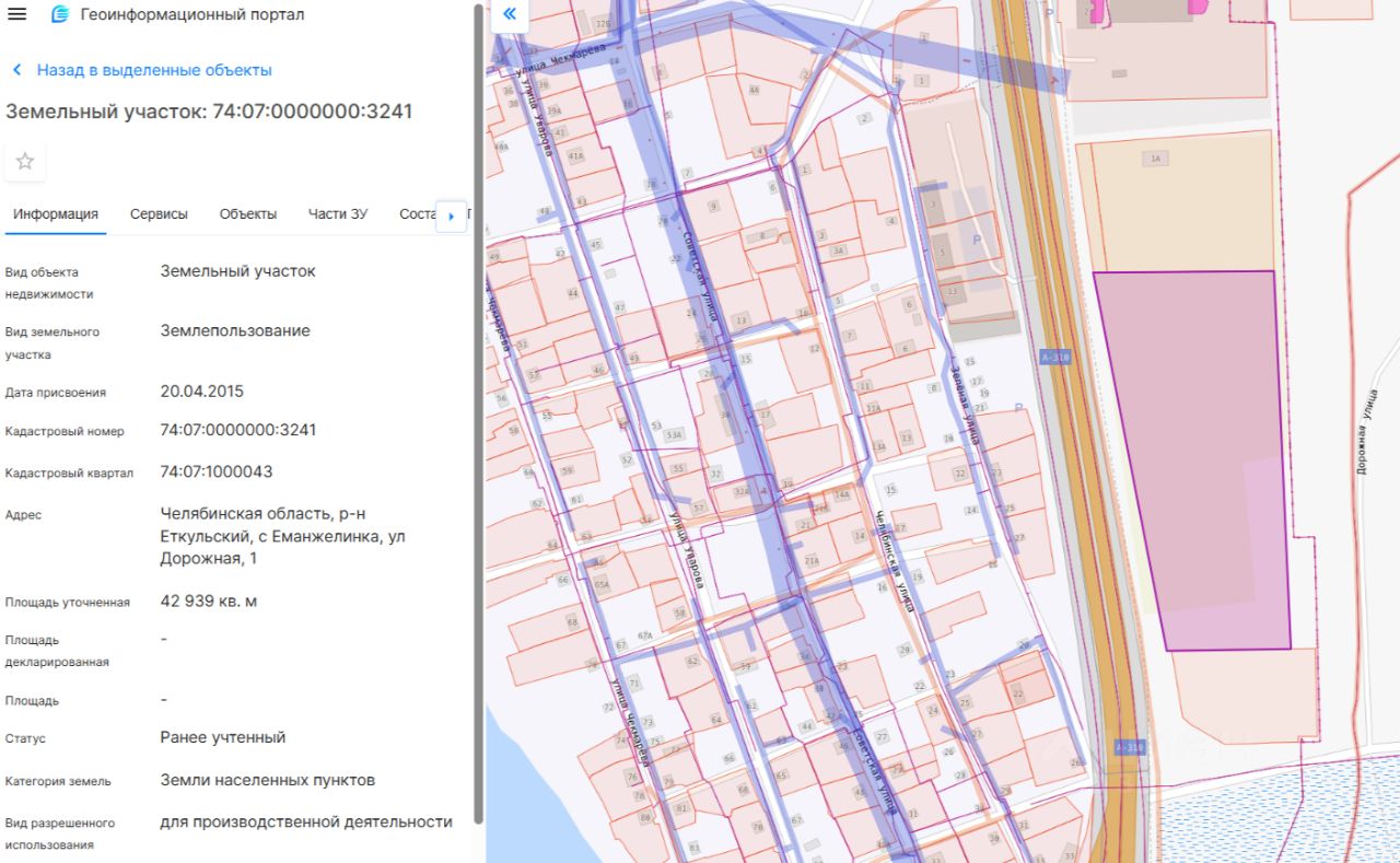 Земельный участок с кадастровым номером: 74:07:0000000:3241, общей площадью: 42 939 +/- 73 кв. м., категория земель: земли населенных пунктов, вид разрешенного использования: для производственной деятельности, адрес (местоположение) объекта: Российская Федерация, Челябинская область, муниципальный район Еткульский, сельское поселение Еманжелинское, село Еманжелинка, улица Дорожная, земельный участок 1