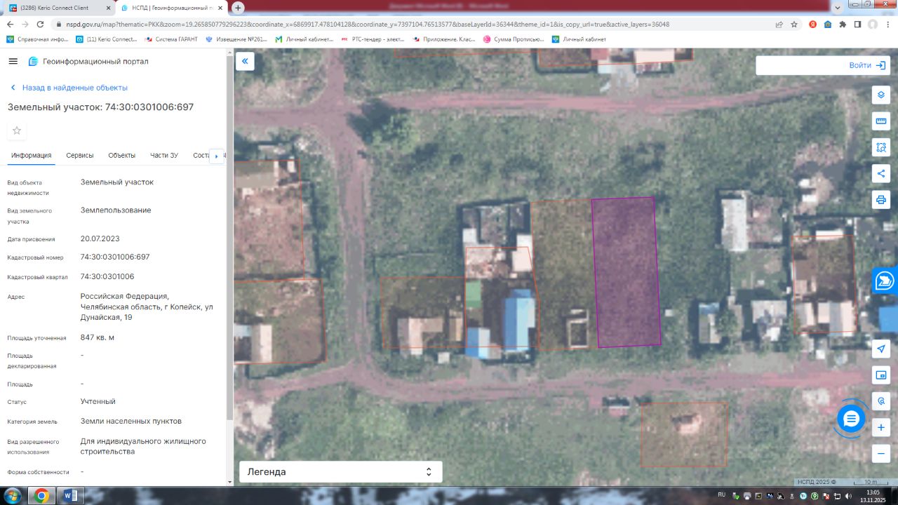Земельный участок с кадастровым номером 74:30:0301006:697 площадь 847 по адресу Российская Федерация, Челябинская область, г Копейск, ул Дунайская, 19