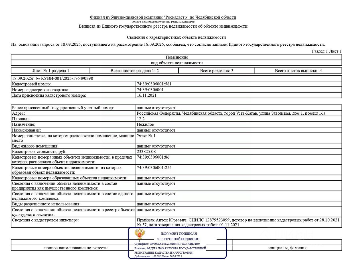 Лот 8 Нежилое помещение, площадью 12,2 кв.м., кадастровый номер: 74:39:0306001:581, реестровый номер: П13740008276, по адресу: Челябинская область, г.Усть-Катав, ул.Заводская, д.1, помещение 16а.
