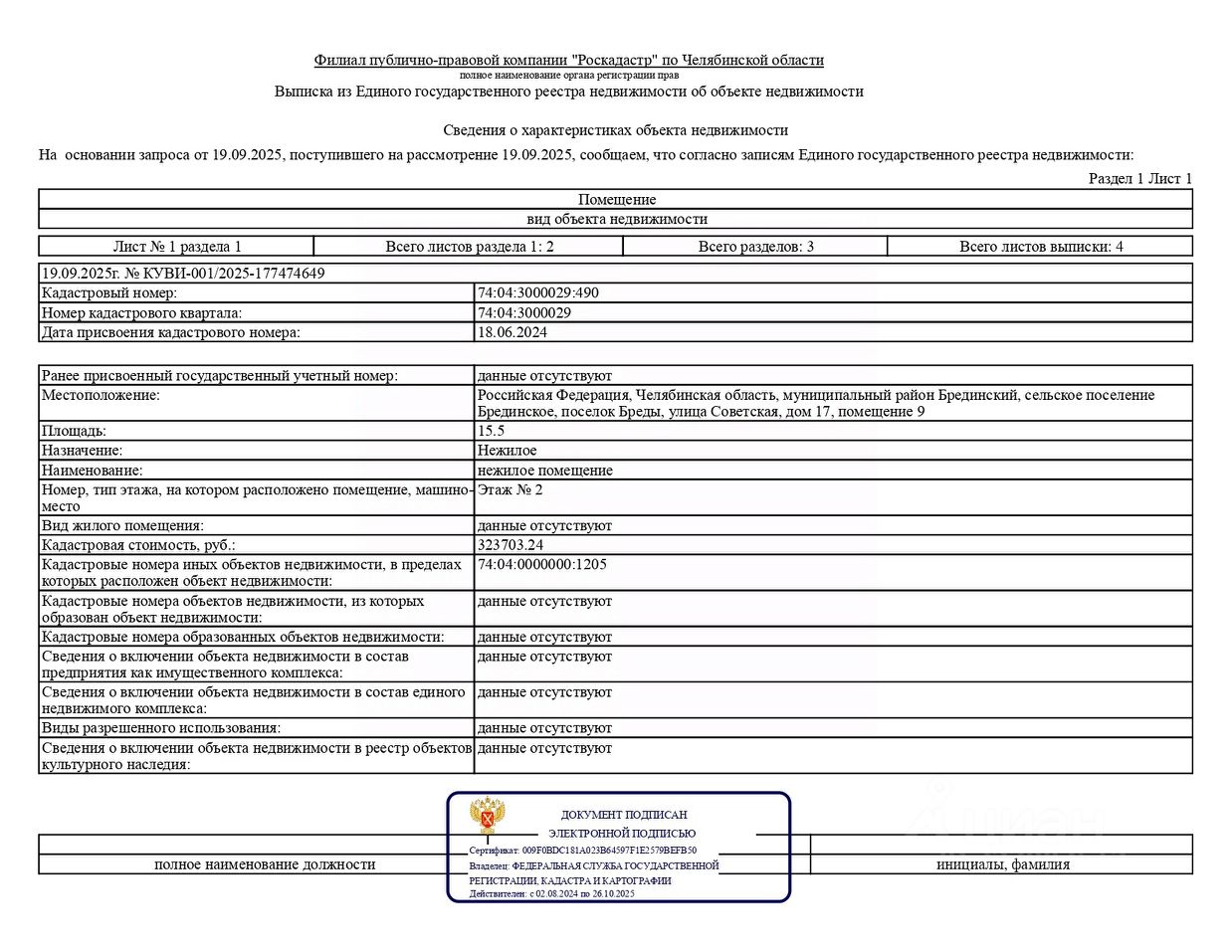 Лот 18 Нежилое помещение, площадью 15,5 кв.м., кадастровый номер: 74:04:3000029:490, реестровый номер: П13740009408, по адресу: Челябинская область, муниципальный р-н Брединский, сельское поселение Брединское, пос.Бреды, ул.Советская, д.17, пом.9.