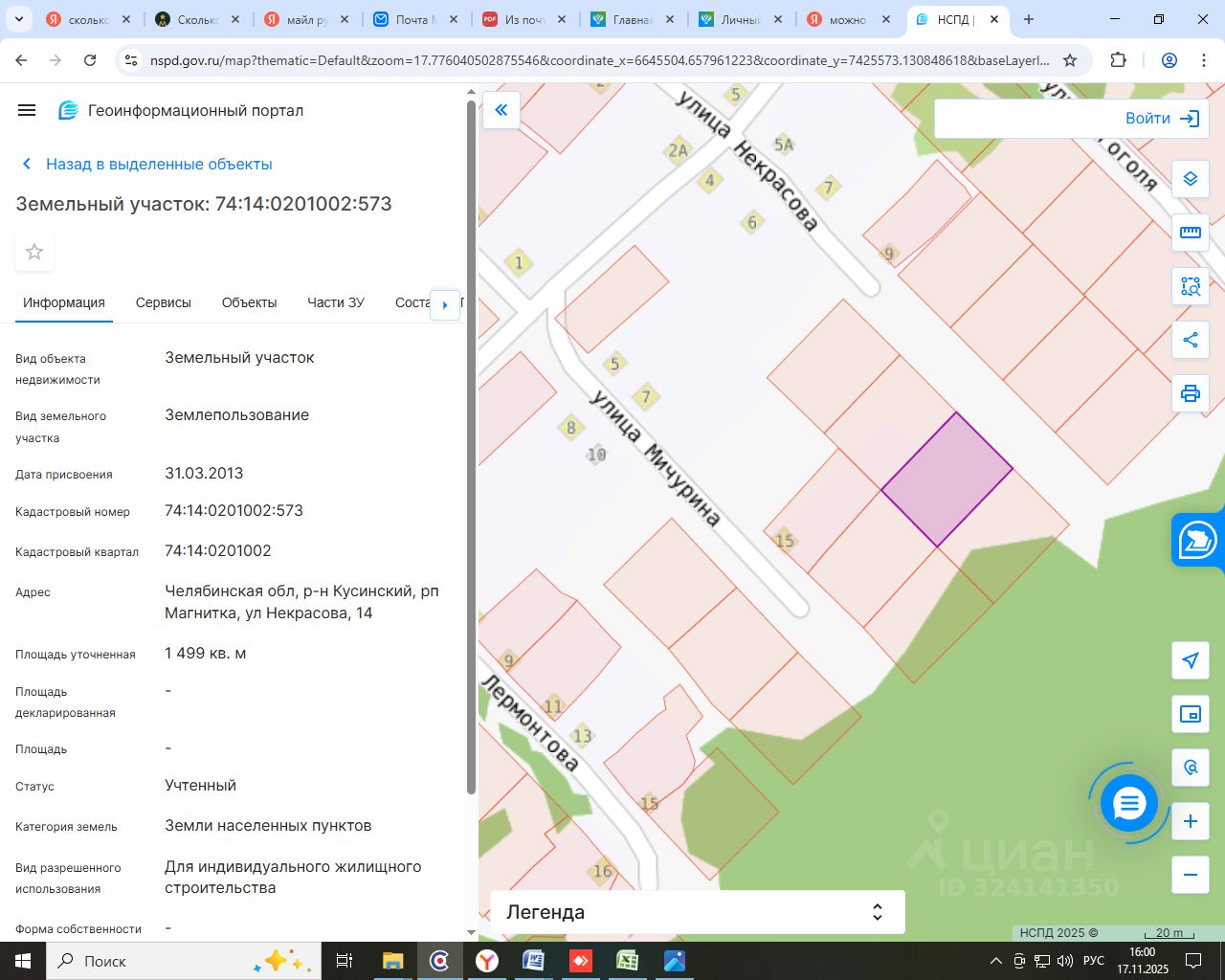 Земельный участок, кадастровый номер 74:14:0201002:573, расположенный по адресу: Челябинская область, Кусинский муниципальный район, , рабочий поселок Магнитка, Некрасова улица земельный участок 14, общей площадью 1499 кв.м