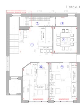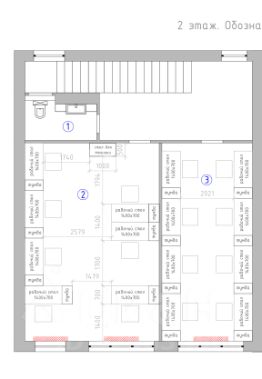 На первом этаже 3 кабинета, кладовая и общее пространство (рецепшен), Один из кабинетов не имеет окна, можно использовать как переговорку или столовую. На втором этаже 2 больших кабинета, сан узел и общее пространство кот. можно использовать как раздевалку или под хранение. Кабинеты на 1 и 2 этаже можно объеденить, стены не капитальные.
