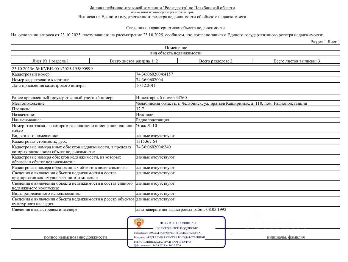 Лот 2 Нежилое помещение, площадью 32,7 кв.м., кадастровый номер: 74:36:0602004:4157, реестровый номер: П13740011547, по адресу: Челябинская область, г Челябинск, ул. Братьев Кашириных, д. 110, пом. Радиоподстанции.