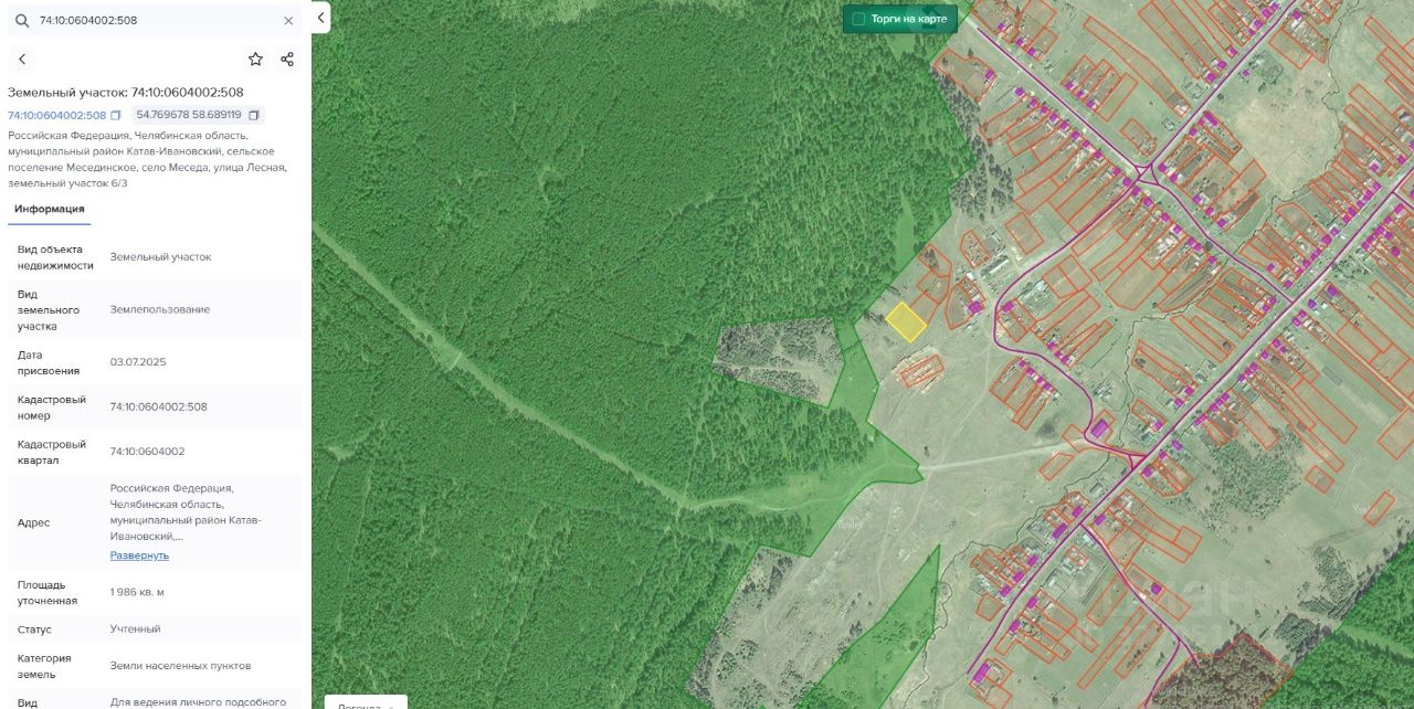 Земельный участок, общей площадью 1986 кв.м, кадастровый номер: 74:10:0604002:508, категория земель: земли населенных пунктов, разрешенное использование: для ведения личного подсобного хозяйства (приусадебный земельный участок), местоположение: Челябинская область, Катав-Ивановский район, Месединское сельское поселение, село Меседа, улица Лесная, земельный участок 6/3, из земель, государственная собственность на которые не разграничена.