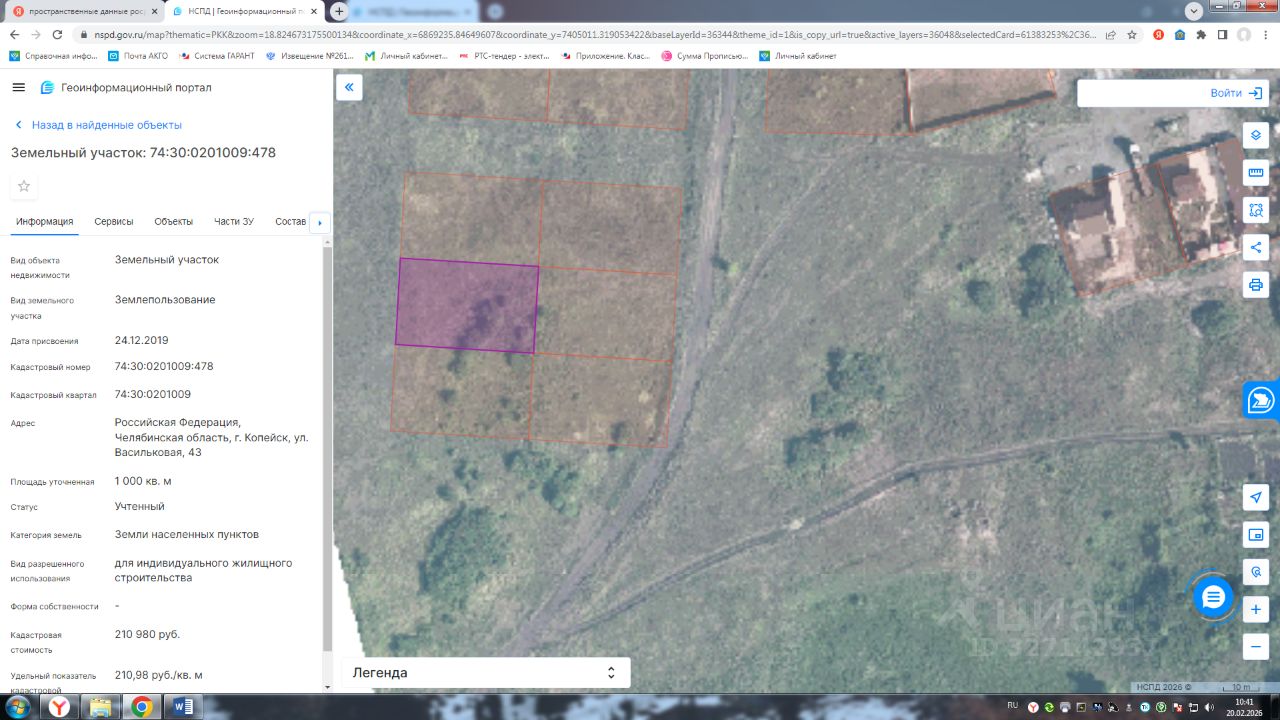 Земельный участок с кадастровым номером 74:30:0201009:478 площадь 1000 по адресу Российская Федерация, Челябинская область, г. Копейск, ул. Васильковая, 43
