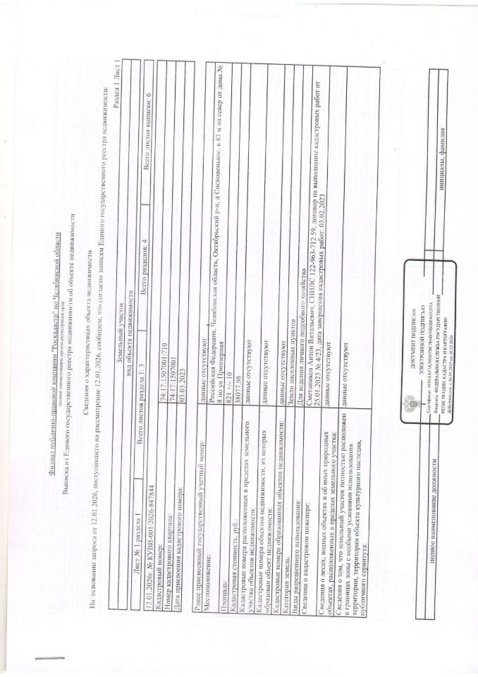 земельный участок из земель населённых пунктов Октябрьского муниципального округа с кадастровым номером 74:17:1507001:710, расположенного по адресу: Челябинская область, Октябрьский район, д. Сосновенькое, примерно в 83 м по направлению на север от дома 8 по ул. Приозерная, разрешенное использование: для ведения личного подсобного хозяйства, общей площадью 821 кв.м