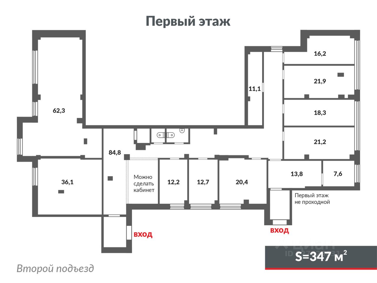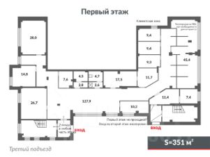 Помещение свободного назначения расположено на первом этаже (347 и 350 кв.м.)