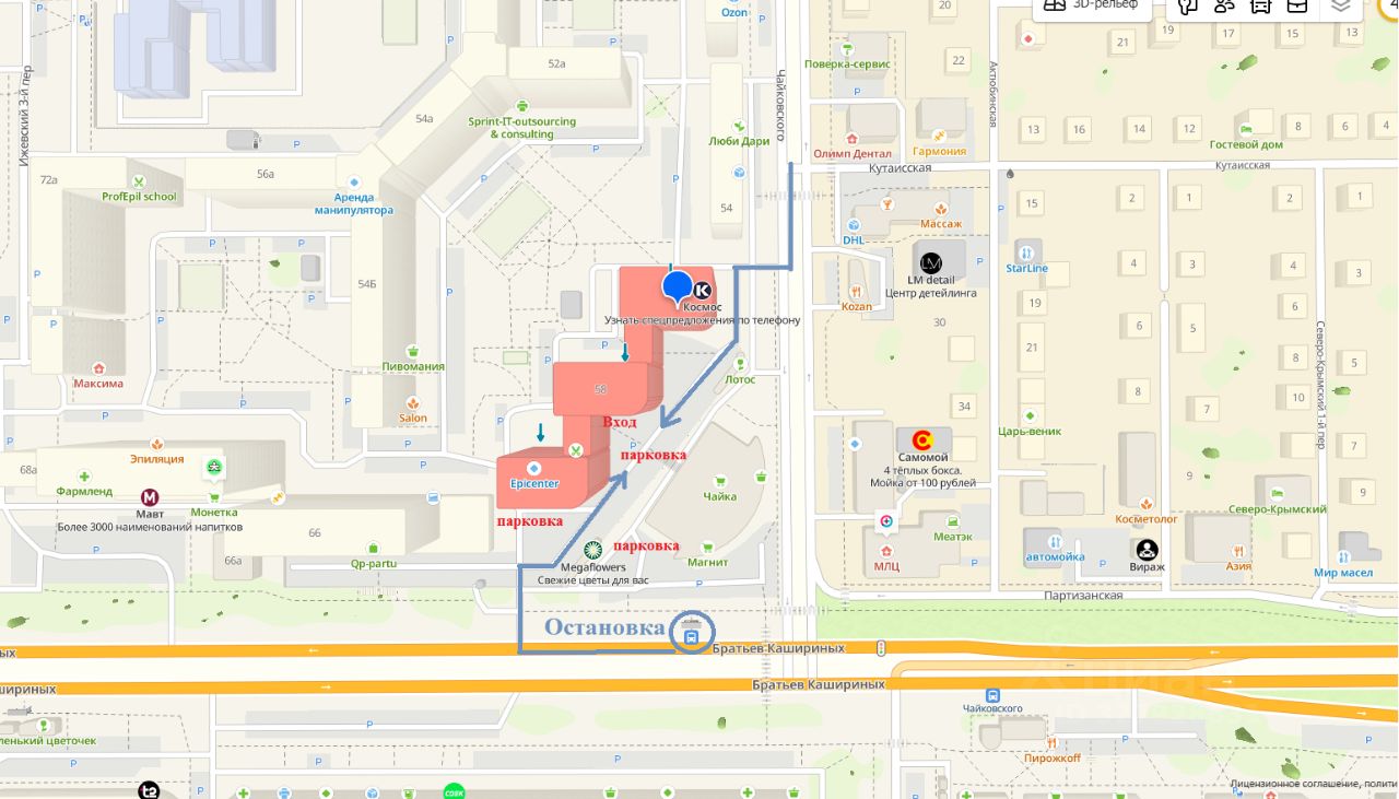 Подъезд к помещению свободный, возможен и с ул. Чайковского и ул. Бр Кашириных, возможен сквозной проезд мимо офиса.