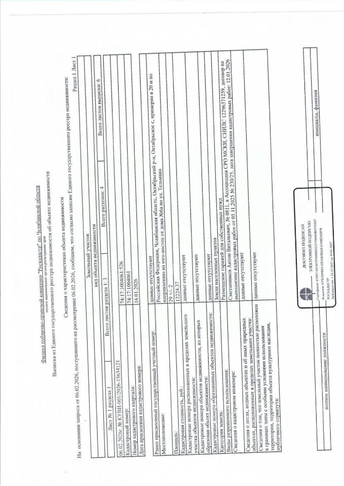 земельный участок из земель населённых пунктов с кадастровым номером 74:17:1004061:526, расположенного по адресу: Челябинская область, Октябрьский район, с. Октябрьское, примерно в 20 м по направлению на юго-восток от дома 6А по ул. Тельмана, разрешенное использование: размещение гаражей для собственных нужд, общей площадью 29 кв.м.