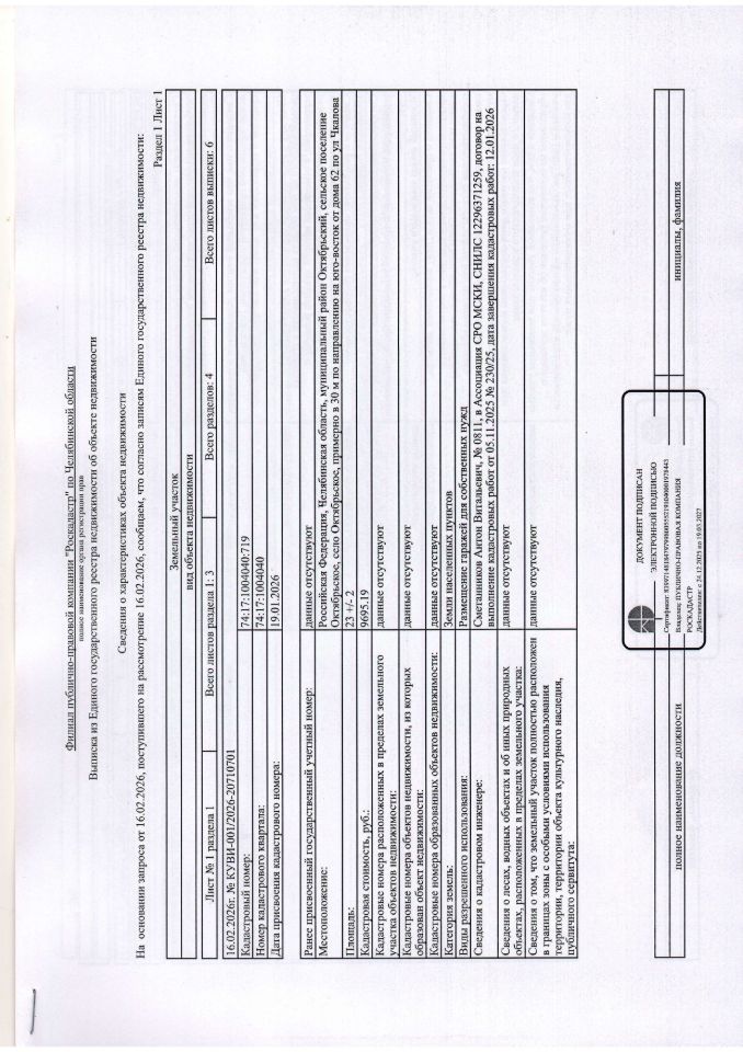 земельный участок из земель населённых пунктов с кадастровым номером 74:17:1004040:719, расположенного по адресу: Челябинская область, Октябрьский район, с. Октябрьское, примерно в 30 м по направлению на юго-восток от дома 62 по ул. Чкалова, разрешенное использование: размещение гаражей для собственных нужд, общей площадью 23 кв.м.