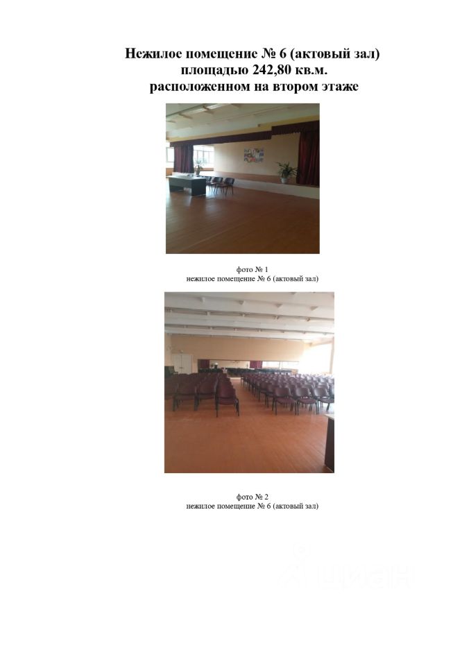 нежилое помещением 6 (актовый зал), площадью 242,80 кв.м., расположенное на втором этаже (51,60 часов в месяц пользования) и места общего пользования (8,60 часа в месяц пользования): 1 (тамбур), 2 (тамбур), 3 (вестибюль), 31 (коридор), 20 (коридор), 15 (раздевалка), 16 (душевая), 17 (туалет), расположенные на первом этаже, 1 (коридор), 8 (подсобное), расположенном па втором этаже, площадью 243,84 кв.м., с общим входом.