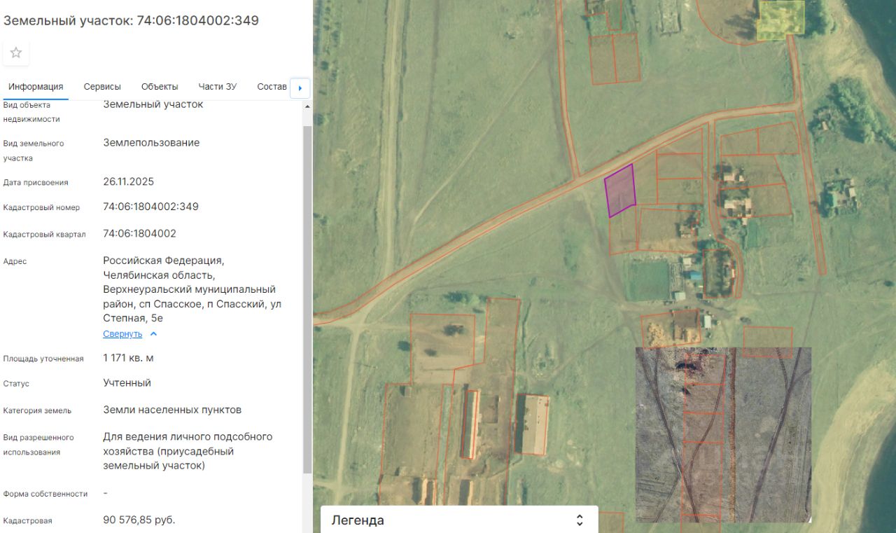 Земельный участок из земель населённых пунктов, с видом разрешенного использования "Для ведения личного подсобного хозяйства", с кадастровым номером 74:06:1804002:349, расположенный по адресу: Российская Федерация, Челябинская область, Верхнеуральский муниципальный район, сп Спасское, п. Спасский, ул. Степная, д.5 е общей площадью 1171 кв.м.