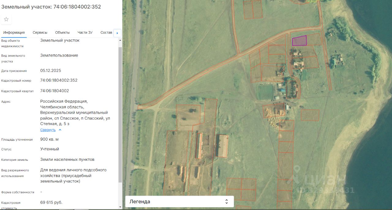 Земельный участок из земель населённых пунктов, с видом разрешенного использования "Для ведения личного подсобного хозяйства", с кадастровым номером 74:06:1804002:352, расположенный по адресу: Российская Федерация, Челябинская область, Верхнеуральский муниципальный район, сп Спасское, п. Спасский, ул. Степная, д.5 з общей площадью 900 кв.м.