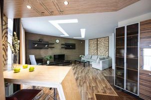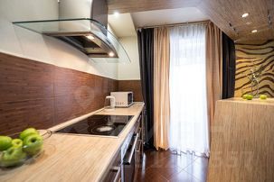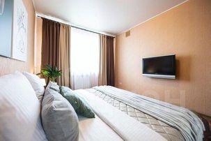 Эксклюзивная большая двухкомнатная квартира. Две раздельные комнаты, большая гостиная-студия, огромная кровать в спальне, дорогой интерьер, наличие кондиционера, двух больших ЖК-панелей, панорамный вид на город с большой лоджии, закрытая территория двора, местоположение в самом центре города придают квартире статус элитного объекта размещения.